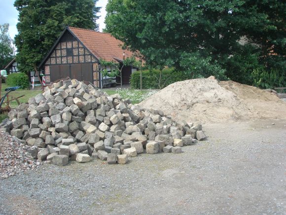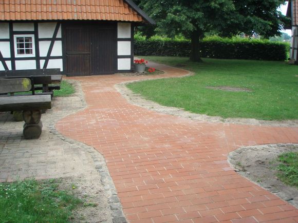 Die alte Wege-Pflasterung wurde durch neue Steine ersetzt. Nötig war die Maßnahme, da die Baumwurzeln das alte Kopfsteinpflaster hochgedrückt hatten und die Steine bei Nässe rutschig waren. Eine gefahrlose Benutzung war nicht mehr möglich. Der Holzhauser Garten- und Landschaftsbau Dirk Prothmann hat in den letzten Wochen mit seiner Mitarbeiterin und seinen Mitarbeitern die Verbindungswege zwischen den Gebäuden neu gestaltet und dabei die vorhandenen Steine als Seitenbegrenzung wieder verwendet. Ein Teil der aufgenommenen Steine wird auch als Podest für gespendete Gerätschaften aus der Landwirtschaft verwendet. Bei dieser Aktion ist auch wieder Eigenleistung des harten Kerns des Vereins gefragt.