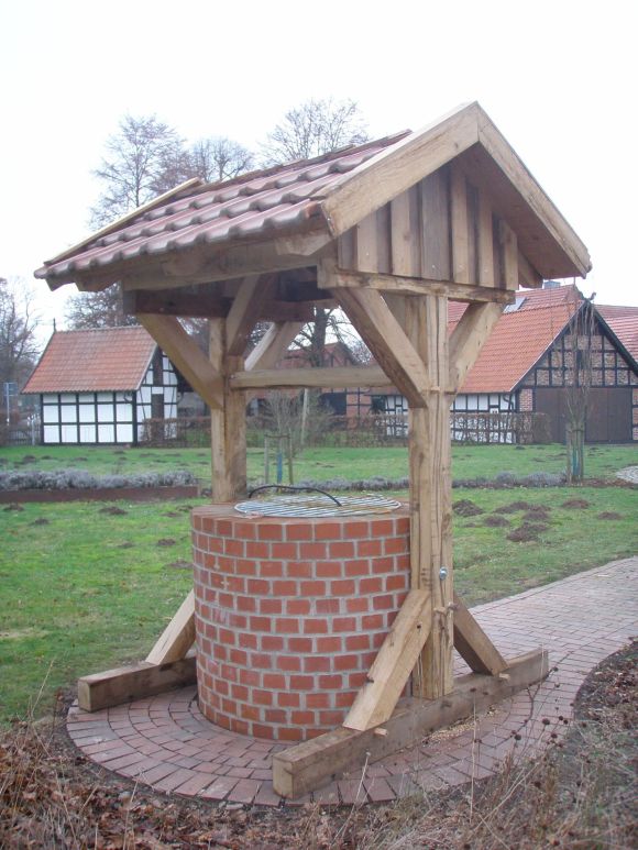 Der alte Brunnen der Familie Busse wurde saniert. Der Rand wurde gemauert und ein massives Eichenholzgestell gezimmert. Dachpfannen vervollständigen den neuentstandenen Blickfang im Dorfgarten.