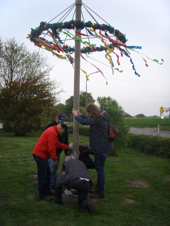Wer mit dem Auto oder mit dem Fahrrad die Minderheider Straße befährt, sieht schon von weitem die bunten Bänder am Maibaum flattern. Es gab wieder die bewährte Arbeitsteilung im Heimatverein: Zwei Frauen schmücken den Ring des Gestells und einige Männer ziehen den schweren Baum hoch und befestigen ihn in einer Haltevorrichtung. Sie wurden von den Zuschauern mit Beifall belohnt.
