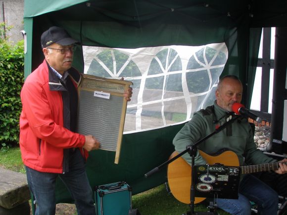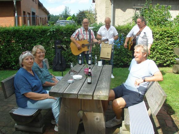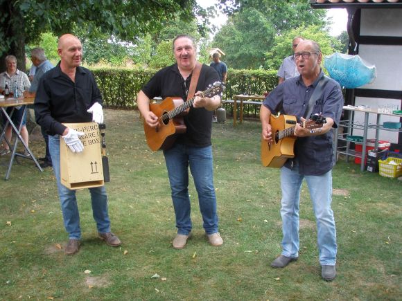 Die drei Mitglieder der Walking Band 500 Smiles bewegten sich über alle Bereiche des Grundstücks an der Minderheider Straße. Mit ihrer Live-Musik zauberten sie wirklich viele Lächeln in die Gesichter der zufriedenen Gäste.