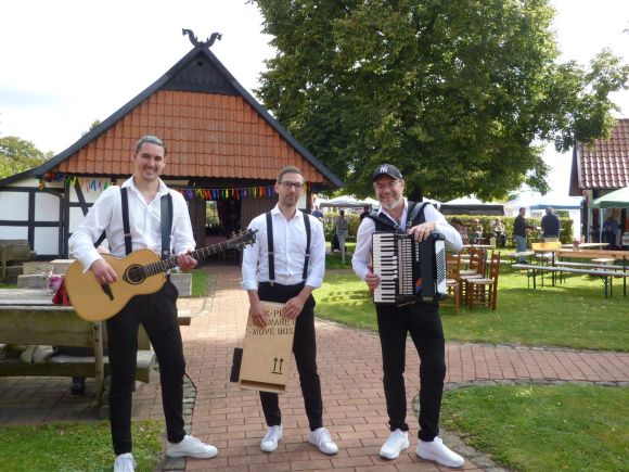 Bei diesen Veranstaltungen spielt die Musik eine wichtige Rolle. An dem Abend an der Schmiede passte alles, auch die Musik. Die Band „modernwalking“ aus Bremen sorgte für gute Stimmung. Ein vielseitiges Repertoire zeichnete sie aus. Sie spielten live im Publikum, d.h. sie gingen von Tisch zu Tisch und passten sich der jeweiligen Stimmung an. Bandmitglied Sören Rodenberg sagte dem HillerWebBlatt , dass sie bundesweit auftreten, bei öffentlichen Veranstaltungen und auch bei Familienfesten Musik machen. In diesem Jahr geben sie 160 Konzerte.