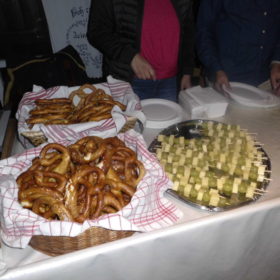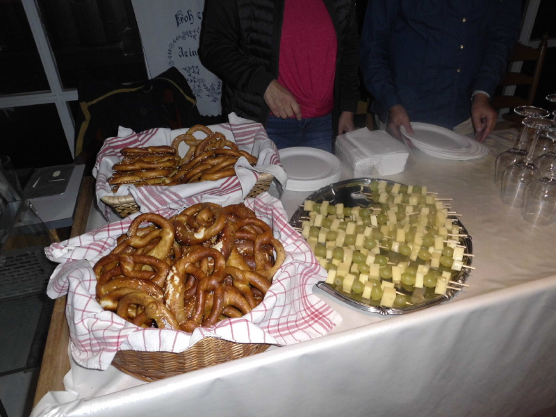 Laugenbrezel und Käse/Trauben-Spieße zusammen mit Wein und anderen Getränken