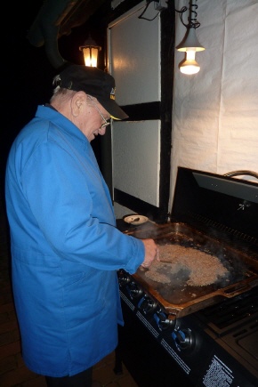 An den gedeckten Tischen in der Handwerksscheune saßen Mitglieder und Unterstützer des Heimatvereins, um die erste Stippgrütze in diesem Herbst zu essen. Die Vorbereitung für diesen Abend war wieder auf einigen Schultern verteilt. Die Räume wurden geputzt, draußen wurden die Wege vom Laub befreit, eine Plane wurde an der Hauswand befestigt, damit die Grütze beim Braten nicht an die Wand spritzt. Die benötigten Lebensmittel wurden gekauft und auch der Korn durfte nicht fehlen, damit der „Schwatte“ gekocht werden konnte. Dieses Heißgetränk aus dünnem Kaffee und Korn gehört traditionell zum Stippgrütze-Essen mit dazu. Etwas Besonders ist immer das nach altem Rezept selbstgebackene Weißbrot, das mit selbst gekochter Marmelade als Nachtisch gegessen wurde.